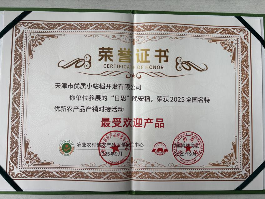 日前,优质小站稻公司作为天津市优质农产品代表企业参加2025全国名特优新农产品产销对接活动。利达粮油旗下“日思晚安稻”从千余款产品中脱颖而出,荣获“最受欢迎产品奖”。